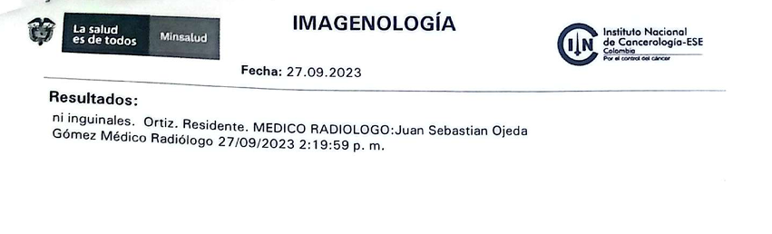 Estudio realizado el día 27 de noviembre de 2023. En el íleon distal en la fosa ilíaca izquierda (Ver imagen de interés) se identifica una lesión endofítica, con realce con el medio de contraste, de contornos lobulados, de 17 x 16 x 12 mm. No se identifica alteración de la grasa adyacente ni compromiso vascular en el presente estudio. Estómago se encuentra distendido, de paredes delgadas, no presenta imágenes, sugestivas de compromiso neoplásico. El colon, sigmoides y recto son de apariencia usual. Apéndice cecal normal. El hígado es de localización, tamaño, contornos y densidad normales. No se identifican lesiones focales o difusas en su parénquima. La vesícula biliar se encuentra distendida, sin lesiones endoluminales. La vía biliar intra y extrahepática son de calibre y curso normales. El bazo, el páncreas, las glándulas suprarrenales y los riñones no presentan alteraciones. No hay dilatación de los sistemas colectores. Bazos accesorios adyacentes al hilio esplénico. Las estructuras vasculares del retroperitoneo tienen calibre y curso normales. No se identifican adenomegalias retroperitoneales, ilíacas o inguinales. Ganglios subcentimétricos pericelíacos, de hasta 6 mm, de aspecto reactivo. La vejiga se encuentra distendida, sin lesiones endoluminales, en el contorno anterior en la inserción del uraco, se observa una pequeña indentación sugestiva de seno del uraco . Próstata de localización y tamaño normal. Lo visualizado de los genitales masculinos sin alteraciones. No hay líquido libre en la cavidad abdominal. Las estructuras óseas visualizadas no presentan alteraciones. Lo visualizado de las bases pulmonares no presentan alteraciones.